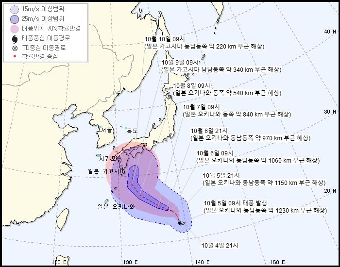 태풍 찬홈은 북서쪽으로 움직이며, 일본 오키나와 동쪽 해상에 가까워져 10월 9일쯤 일본 가고시마 남동쪽 해상으로 올라올 전망입니다.