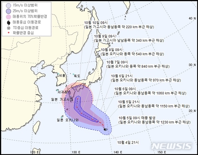 또한 8일 오전 9시께 일본 오키나와 동쪽 약 540km 부근 해상에 도달하여 강도 '강'의 태풍으로 커질 것으로도 내다보았습니다.