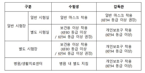 또한 발열 등 유증상 수험생과 의심증상이 있어, 별도의 공간에서 시험을 보는 경우 보건용 마스크 이상(KF80 동급 이상)을 착용해야 합니다.