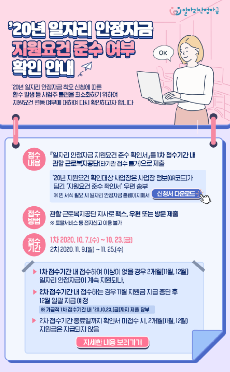 먼저 일자리 안정자금이란 2020년 최저임금 8,590원의 인상으로 인해 소상공인 및 중소기업에 대한 사업부담을 완화함을 물론, 노동자의 고용안정까지 고려하여 사업주에게 지급하는 지원금입니다.