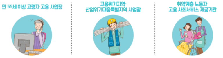 ●만 55세 이상의 고령자 고용사업장이나 산업위기대응특별지역 내 사업장, 고용위기지역 사업장은 300인 미만까지 지원이 가능합니다.