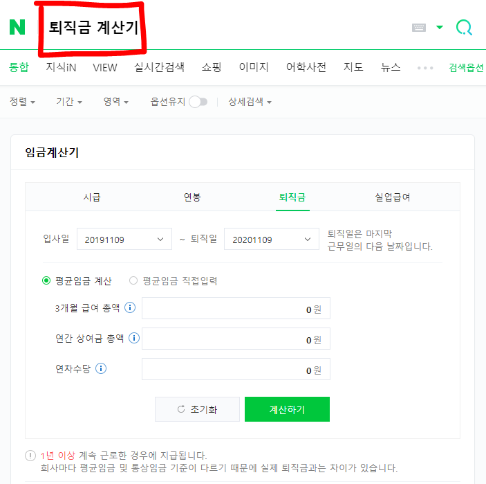 검색하면 바로 퇴직금 계산기가 뜨는데요, 값을 입력하시고 계산해보시면 편합니다.