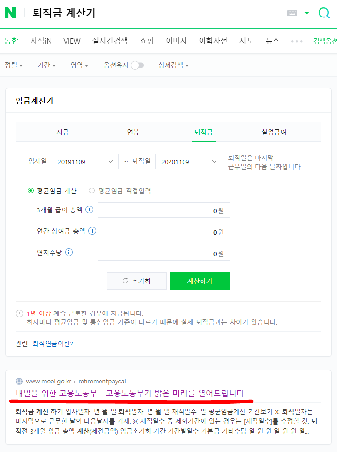 퇴직금 계산기 첫번째 방법입니다. 초록창에 퇴직금 계산기를 검색해줍니다.
