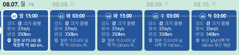 상륙 직전인 8월 9일부터는 전국 대부분의 지역에 비가 올 예정입니다.