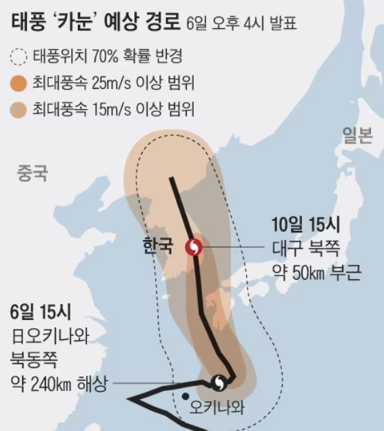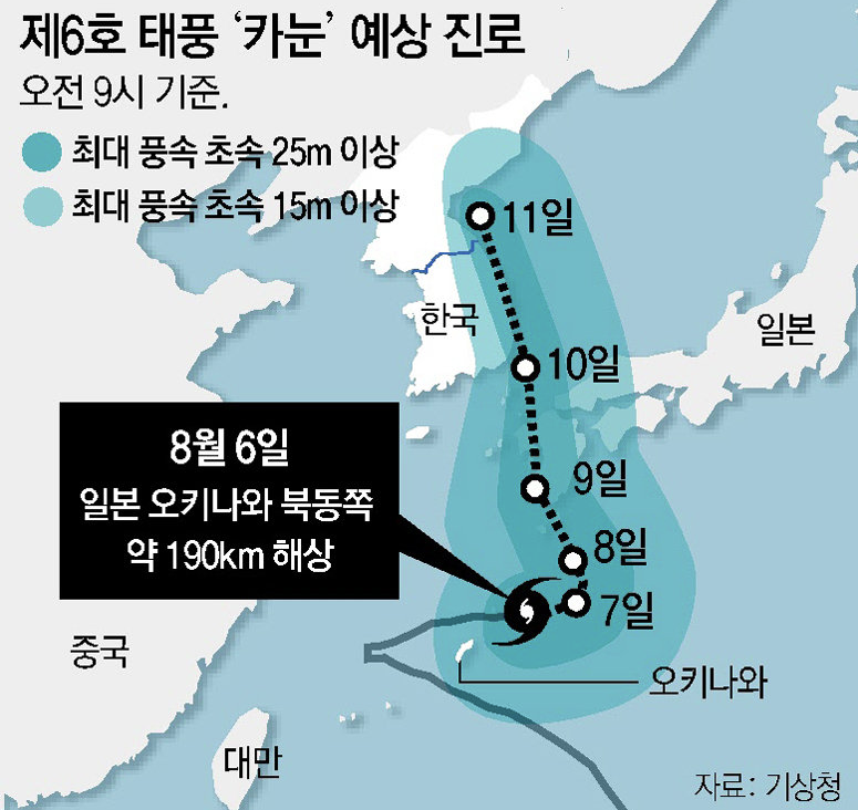 기상청은 제 6호 태풍 카눈이 7일 오전 9시에 일본 오키나와를 강타한 뒤 방향을 틀어 한반도를 관통할 것으로 보인다고 밝혔습니다.