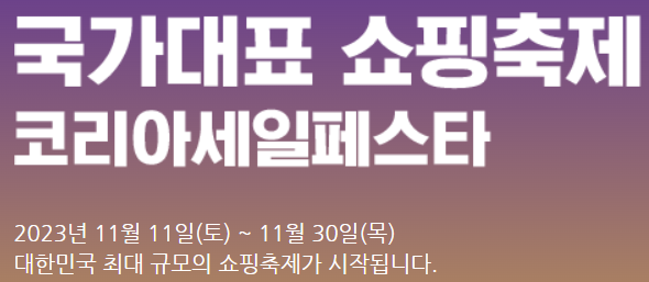 우리나라 최대 쇼핑축제인 2023 코리아세일페스타가 11월 11일부터 30일까지 역대 최대 규모로 개최됩니다.