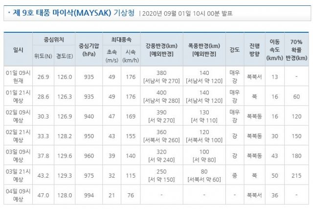 태풍 매미 때 무섭고 아찔했던 기억이 아직도 생생한데 매미보다 위력이 더욱 더 강한 마이삭이 오고 있다니 벌써부터 긴장되고 무섭네요.. 여러분들도 대비 철저히 하셔서 최대한 피해를 줄여봅시다. 감사합니다. 무탈한 하루 보내세요.
