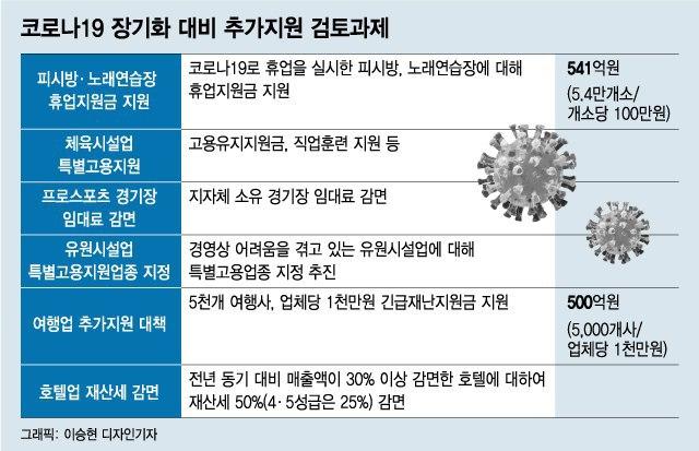 문화체육관광부의 '코로나 피해지원 현황 및 향후계획'에 의하면 당정은 전국 5만 4000여 개의 PC방과 노래방에 '휴업 보상비'로 100만 원씩 현금 지급 및 방역물품 지원으로 541억 원을 책정하였습니다.