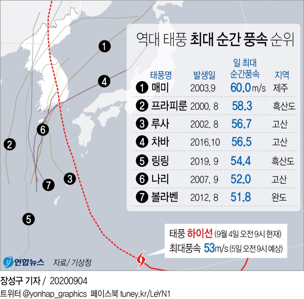 태풍 하이선은 4일 오후 매우 강한 태풍으로 발달할 전망이며, 5일에는 최대풍속이 '초강력'에 가까운 초속 53m에 달할 것으로 예상되고 있습니다.