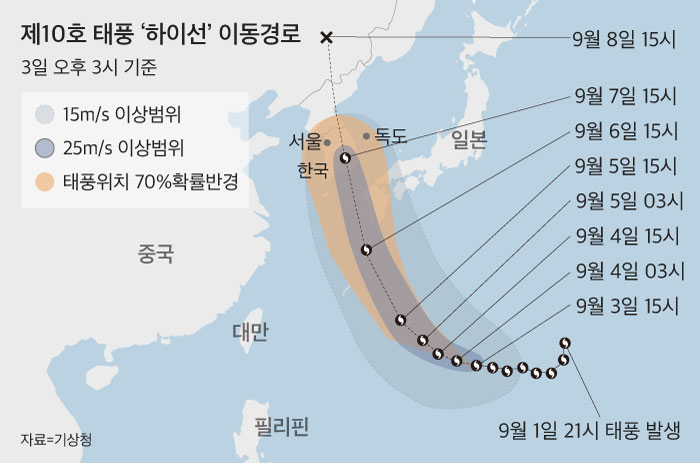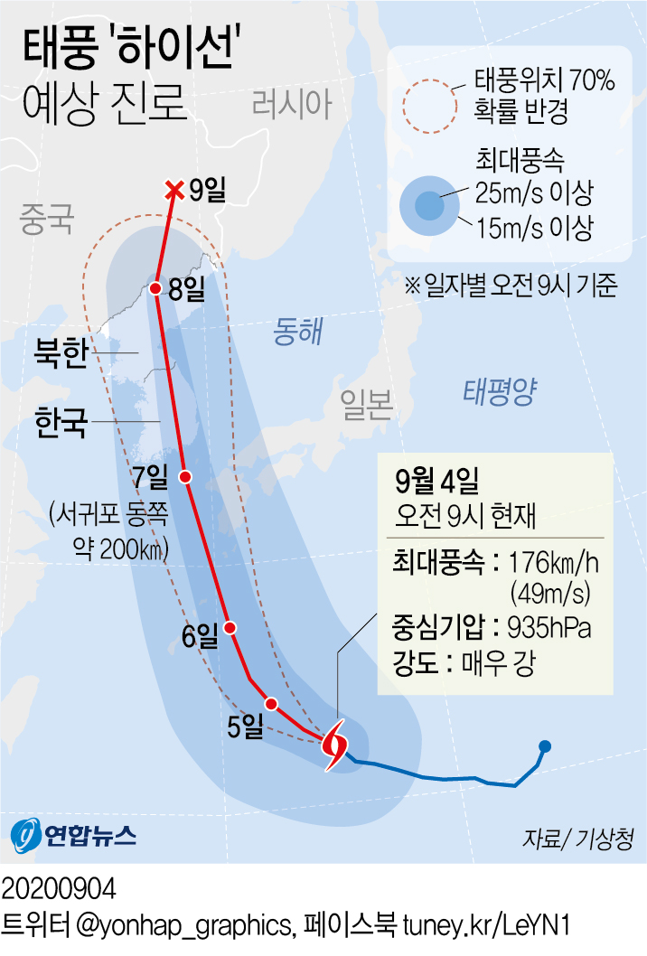 기상청 관계자는 "하이선이 우리나라 부근으로 올라올 때 고수온 해역을 거쳐 오면서 강한 태풍으로 발달하여 우리나라에 영향을 줄 가능성이 크다"라고 말하며 "다만 구체적인 경로나 일본 열도를 거치는지 여부에 따라 변동이 생길 수 있다"라고 설명했습니다.
