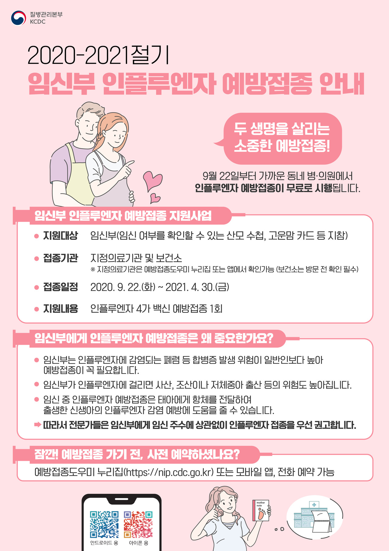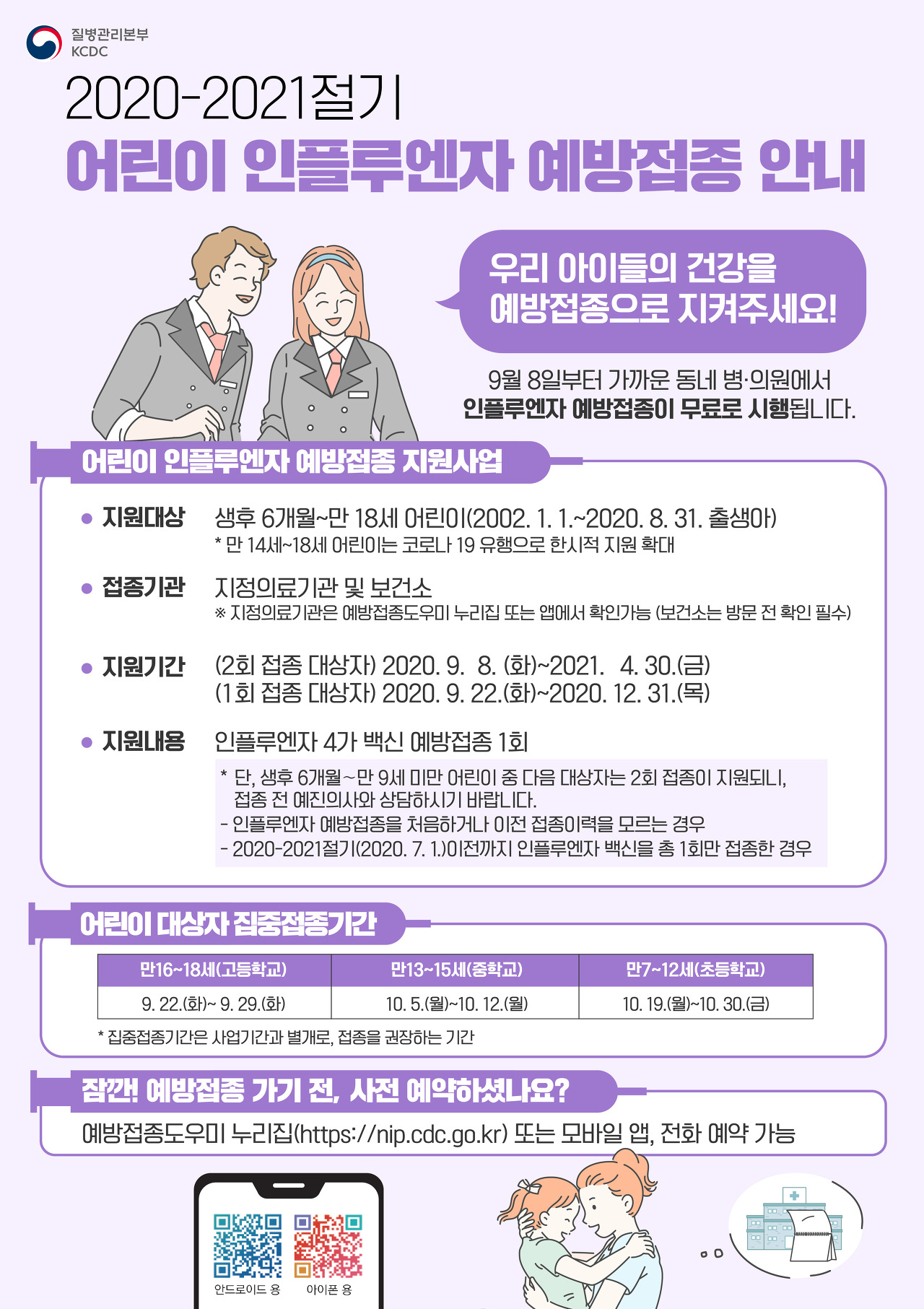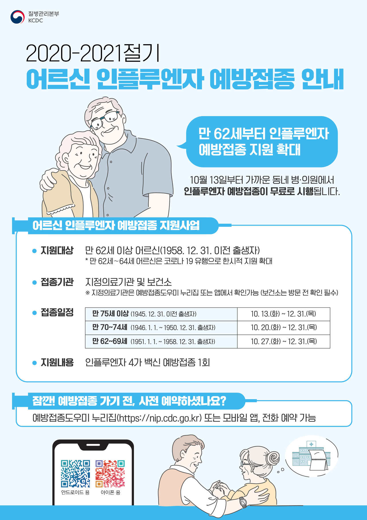 여기에 더해 올해는 코로나 유행으로 인플루엔자 예방이 더욱 중요해짐에 따라 중·고등학생인 만 13세~만 18세(285만 명), 만 62~64세(220만 명)도 독감 무료 접종 대상자로 포함되었습니다.