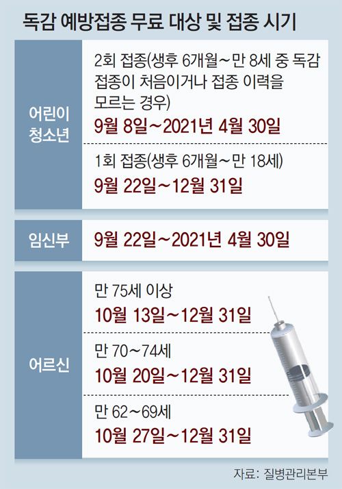 독감 무료접종대상이 한꺼번에 몰리는 것을 막기 위해서 연령별로 나뉘어서 독감 예방접종 시기가 분산되고, 사전 예약도 권장됩니다. 또한 방역당국은 코로나와 인플루엔자를 동시에 검사할 수 있는 진단도구 도입도 추진하기로 했습니다.