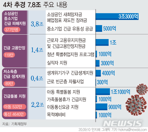 9월 10일 정부는 7조 8천억원 규모의 4차 추가경정예산안을 확정하면서 절반에 가까운 3조 8천억 원을 중소기업과 소상공인 피해 지원에 배정하였습니다. 이 가운데 3조 2천억 원이 사회적 거리두기로 피해가 막심한 소상공인의 경영 안정을 위해 신설된 '소상공인 새희망자금'에 할당되었습니다.